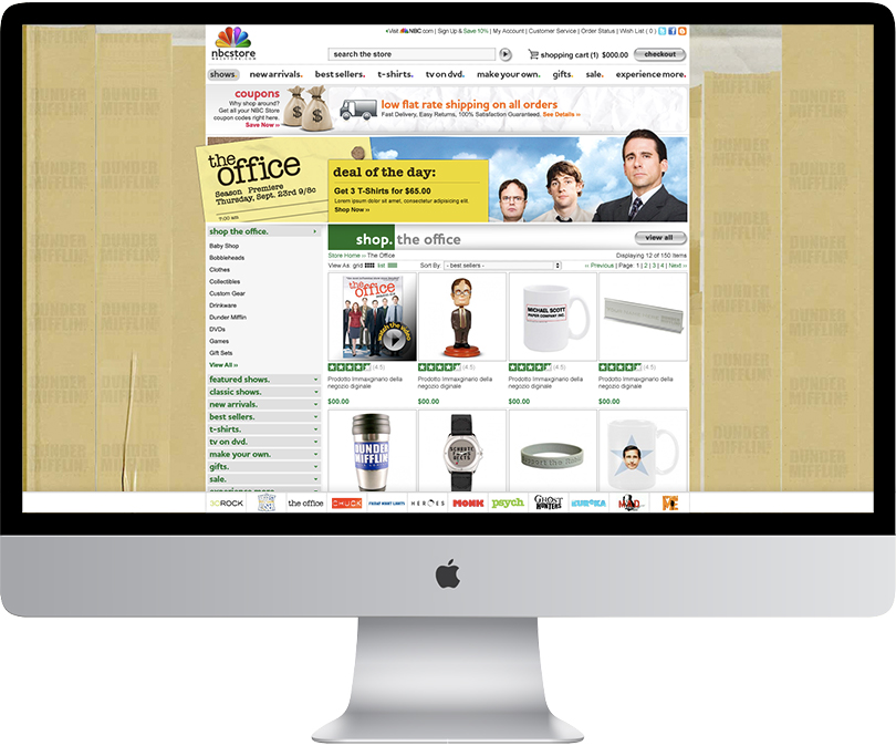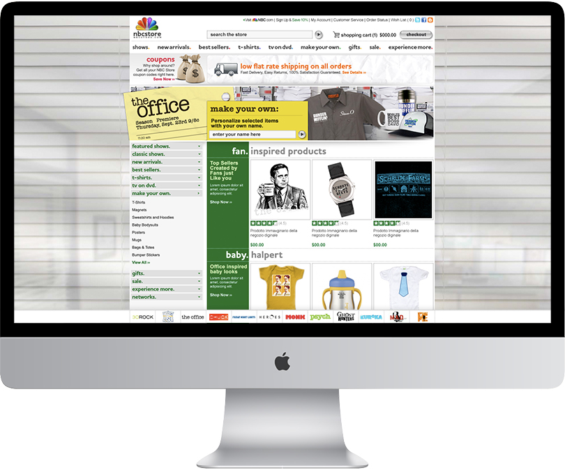 NBCUniversal is one of the world’s leading media and entertainment companies in the development, production, and marketing of entertainment, news, and information to a global audience. I was charged with designing and overseeing the build for The Official Online Store for NBCUniversal and all of its subsidiary brands including NBC, USA, Syfy, CNBC, Universal, Telemundo, Chiller, Sleuth, msnbc, NBC Sports, and the NBC Olympics. The store features a massive catalog of program related product, including DVDs, CDs, books, apparel, collectibles and drinkware.