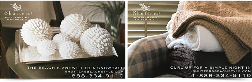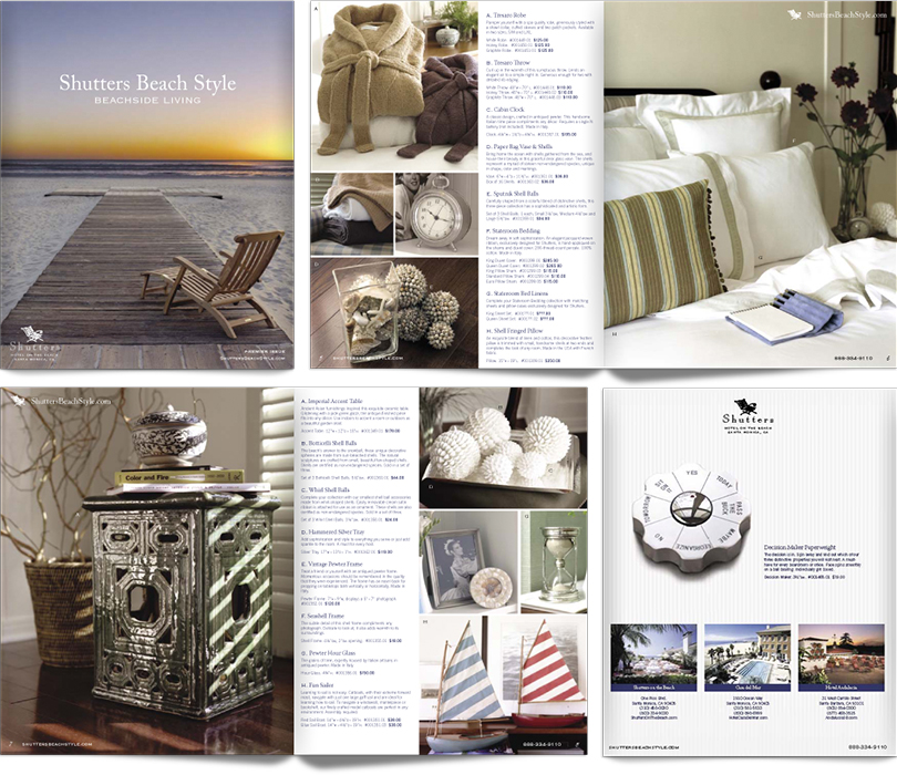 Shutters is home to the most luxuriously casual guest rooms and spa in Santa Monica. Luxury is in every corner. From impeccable service to innovative amenities guests are made to feel like they are in their very own, very exclusive beach home. The In-room catalog and accompanying website allowed guests to bring a piece of their Shutters By The Beach experience home no matter where they live.