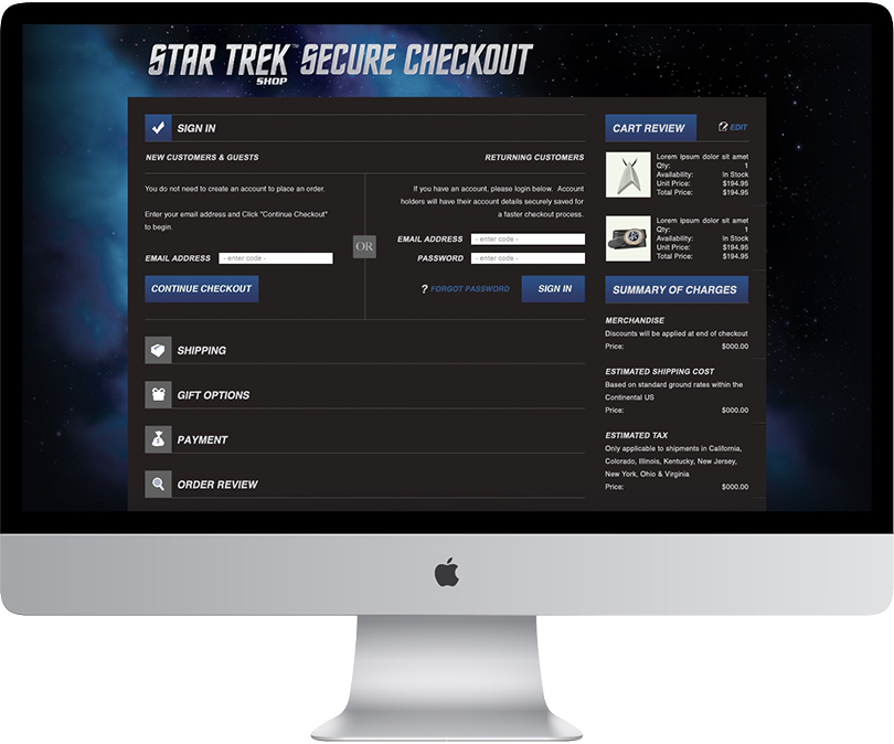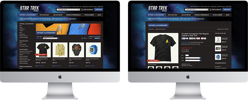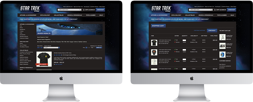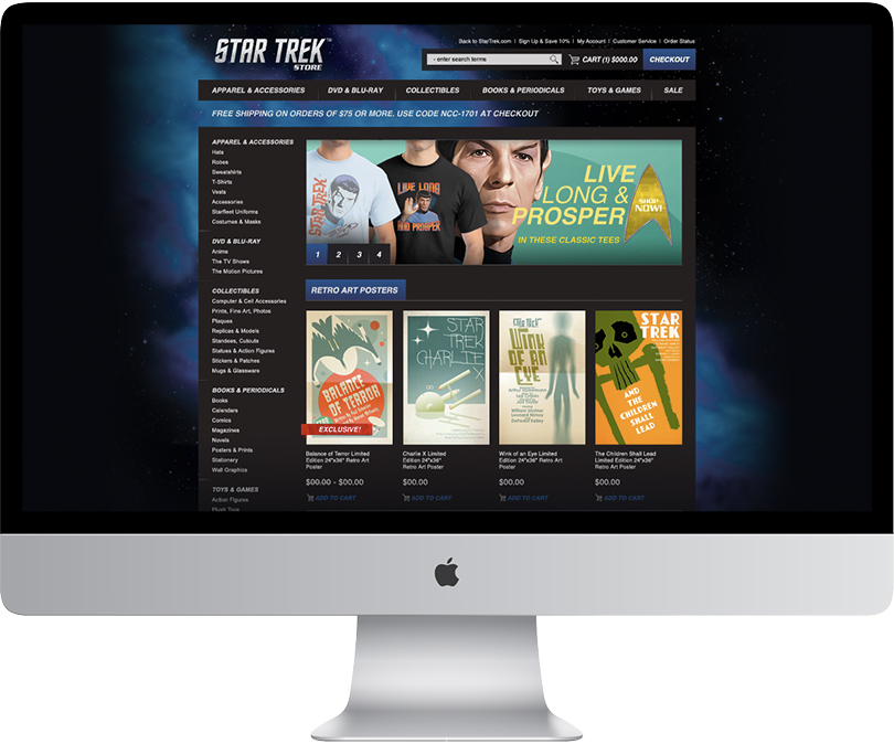 With twelve feature films and seven television series spanning a period of 60 years, the Star Trek franchise has had a wide range of spin-offs including games, novels, toy lines and replicas. To house the growing merchandise assortment, the Star Trek Online Store received a facelift that coincided with the franchise reboot in 2012.