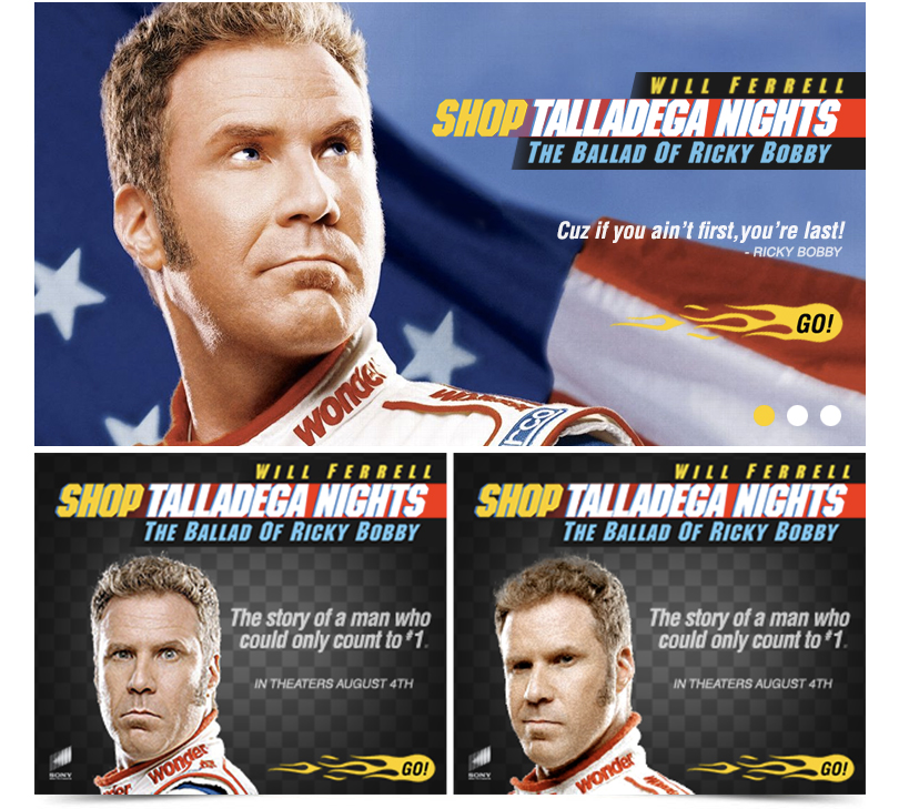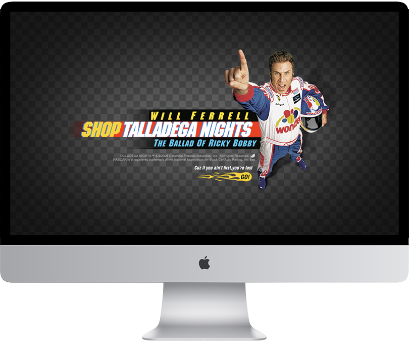 Talladega Nights: The Ballad of Ricky Bobby is a 2006 American comedy film starring Will Ferrell, John C. Reilly, & Sacha Baron Cohen. Working closely with the people from Sony Pictures, I designed an e-commerce site that launched in conjunction with the theatrical debut of the film.